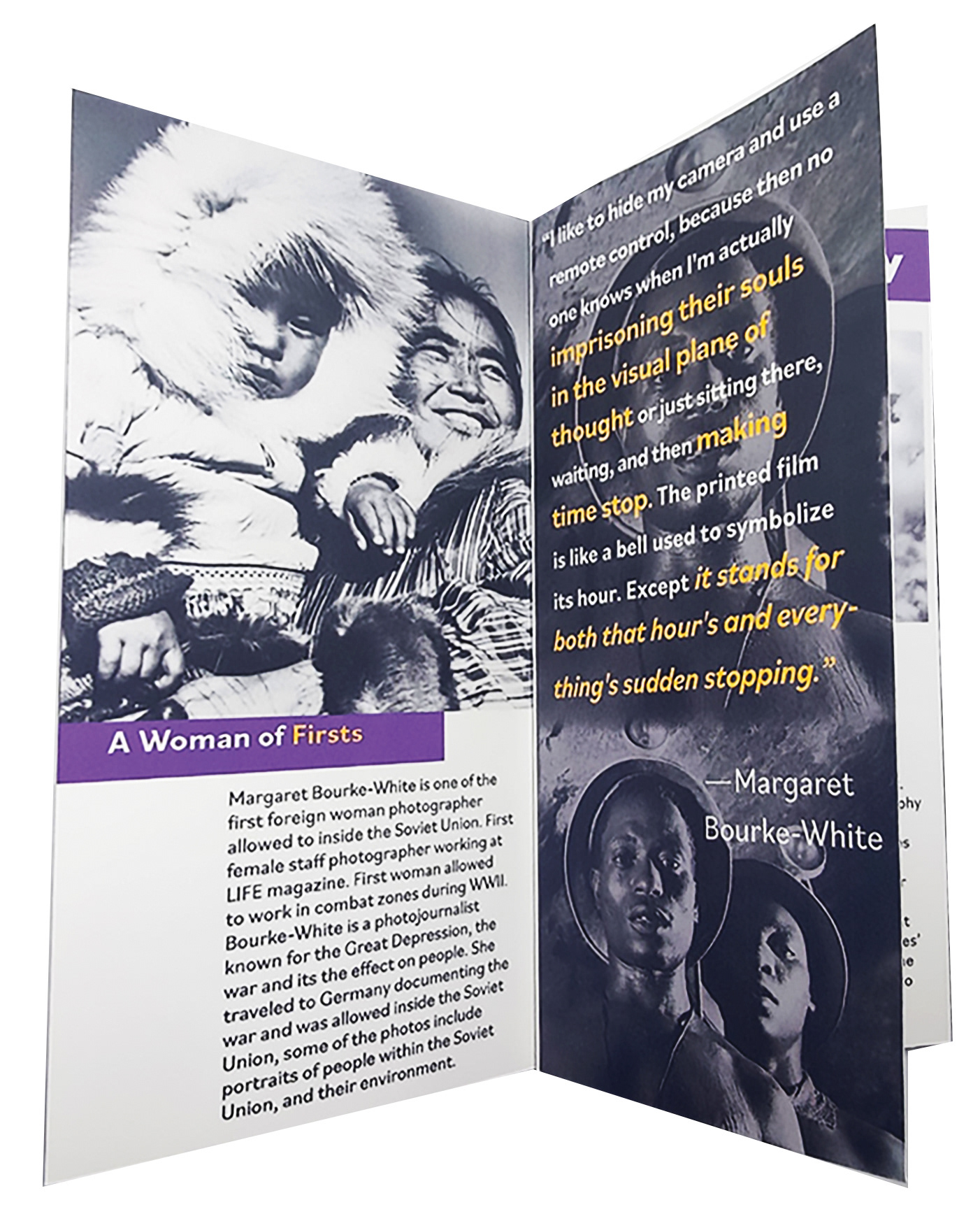 This project was to demonstrate my design ability to create a pamphlet of information on Margaret Bourke White. All the photos had to be in grayscale, and using lines of color to give dimension to the piece.