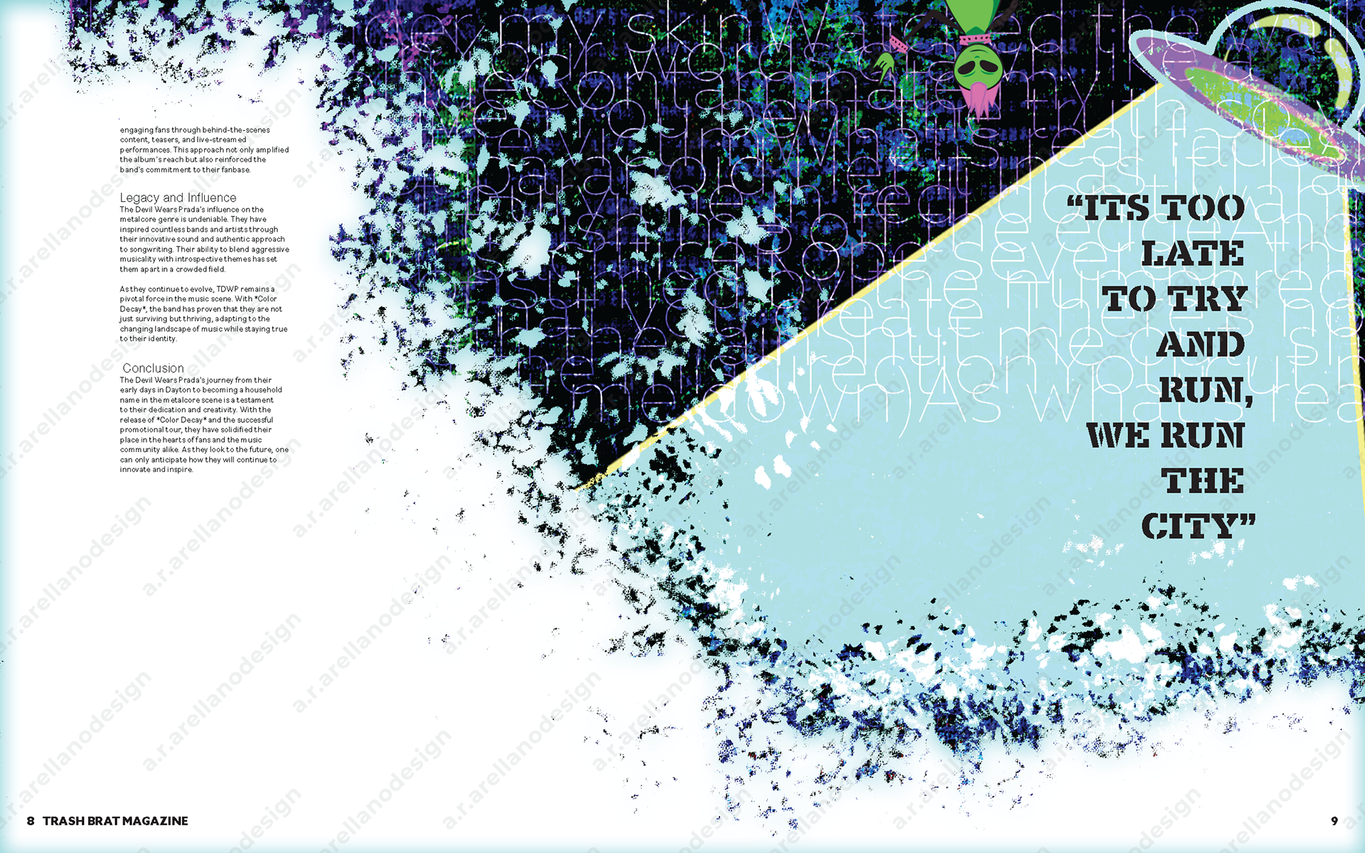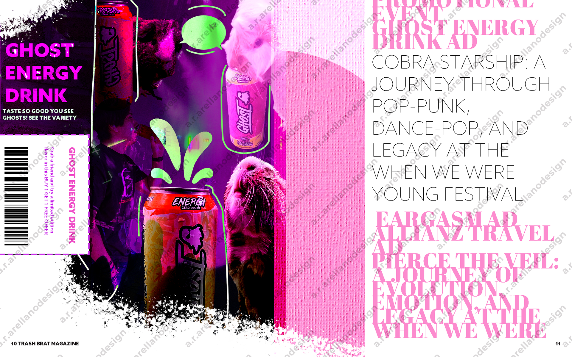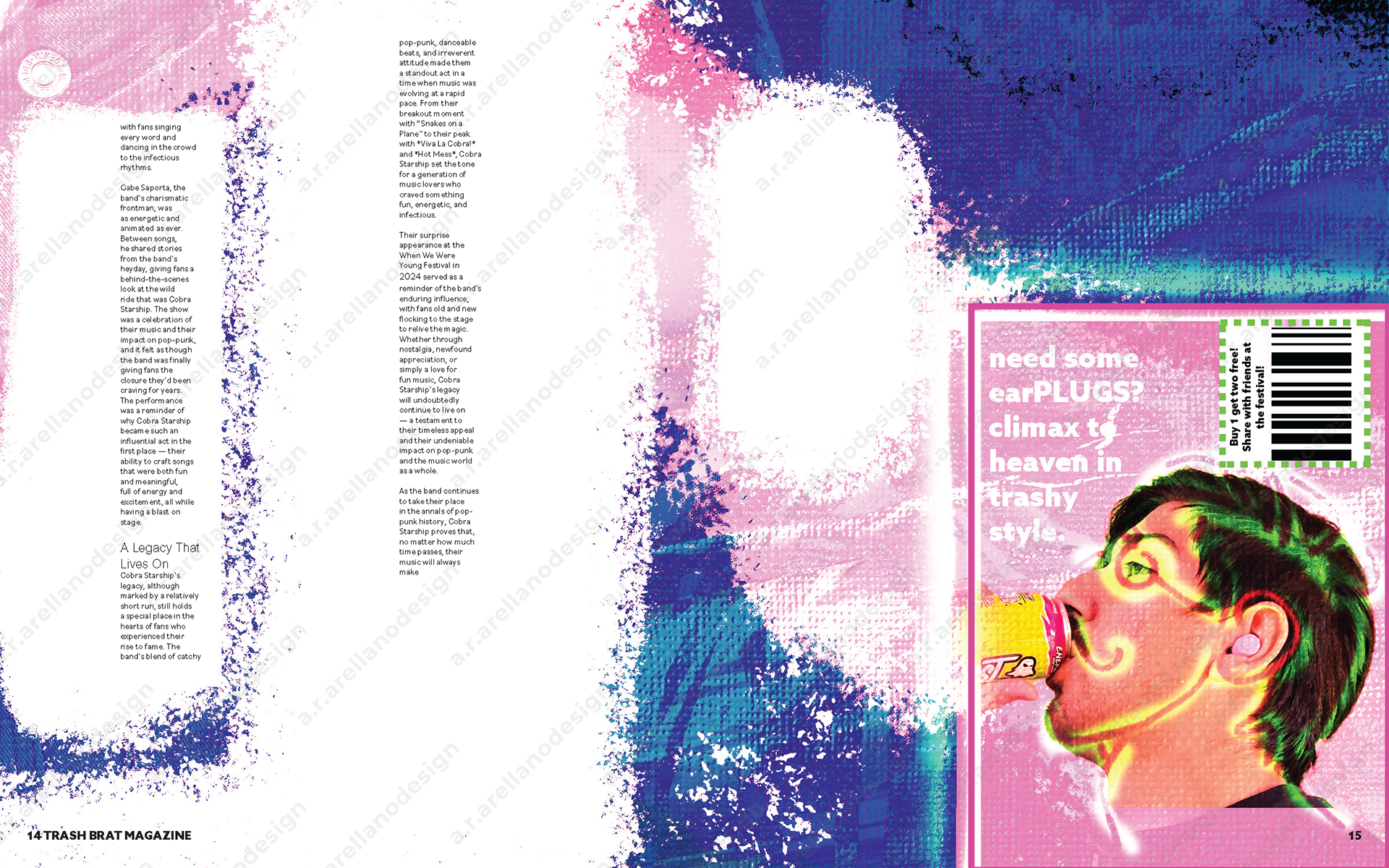 The magazine is designed to emulate the pop punk aesthetic; it embraces a postmodern style and aligns with the readers who are expecting a magazine in the style of a When We Were Young alien punk music festival. This specific project is designed to match the style of a pop punk music festival. While for other magazines, a clean layout with clear imagery would be best, this magazine leans into the creative styling of its readers.