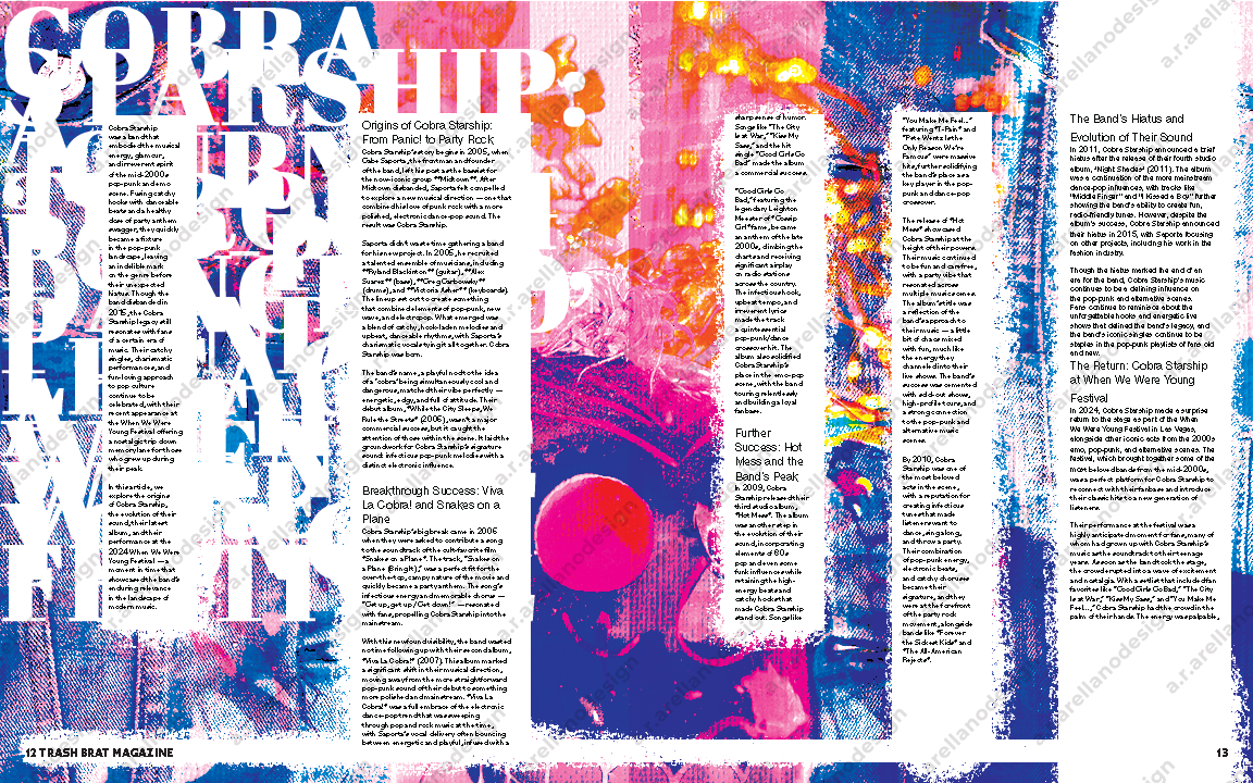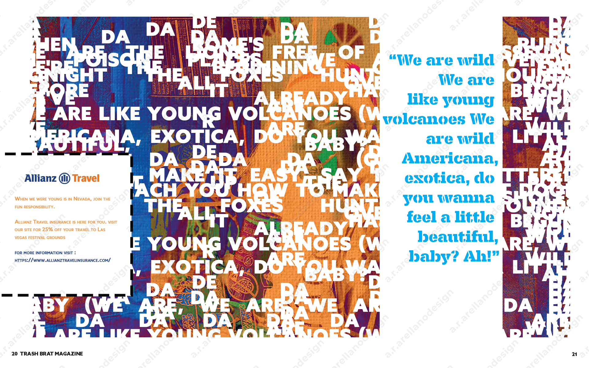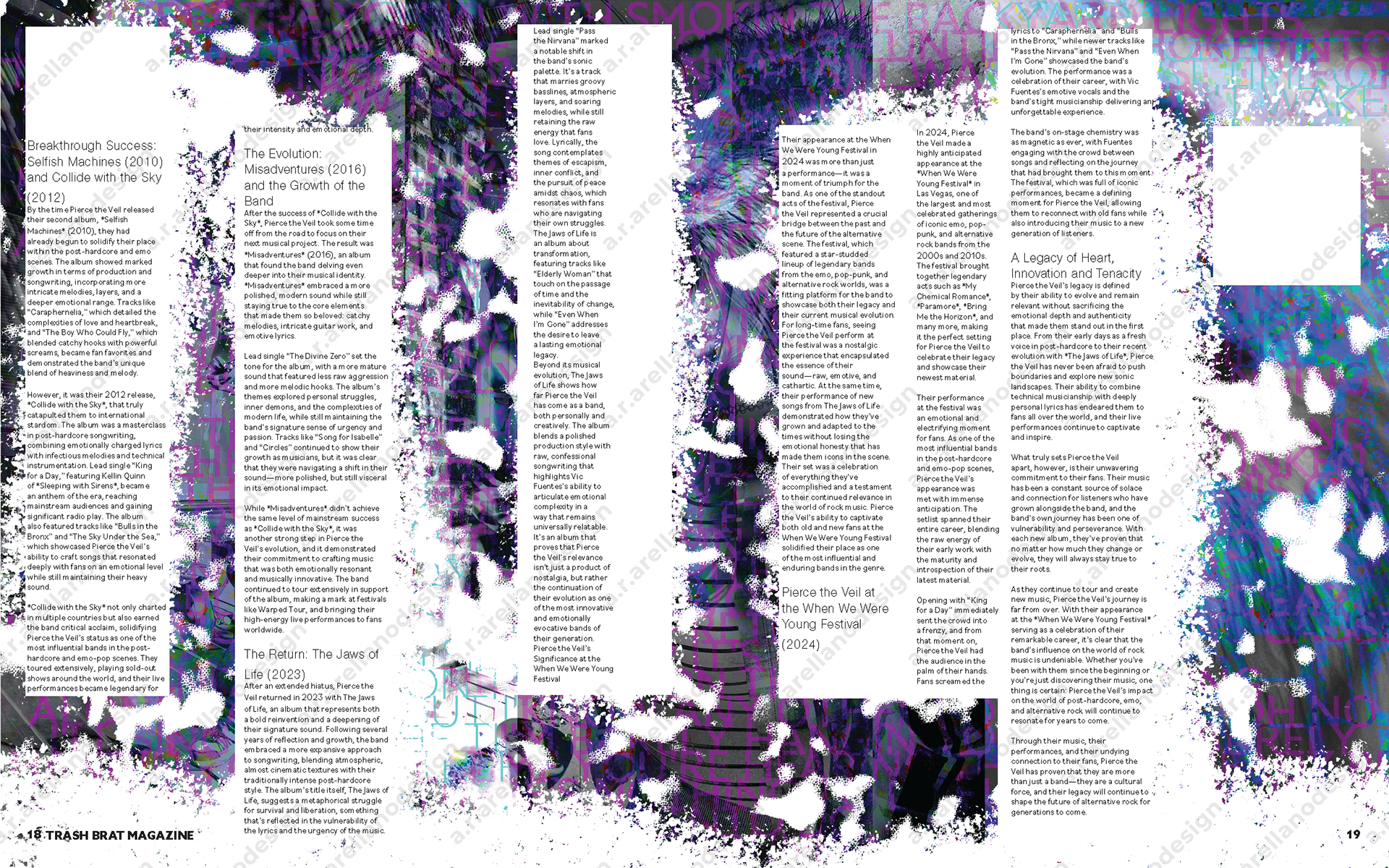 The magazine is designed to emulate the pop punk aesthetic; it embraces a postmodern style and aligns with the readers who are expecting a magazine in the style of a When We Were Young alien punk music festival. This specific project is designed to match the style of a pop punk music festival. While for other magazines, a clean layout with clear imagery would be best, this magazine leans into the creative styling of its readers.