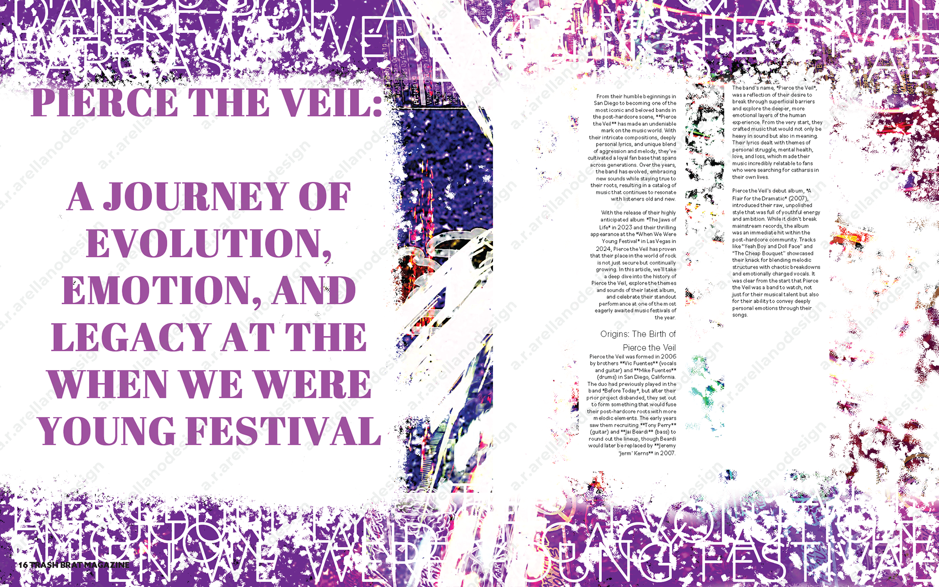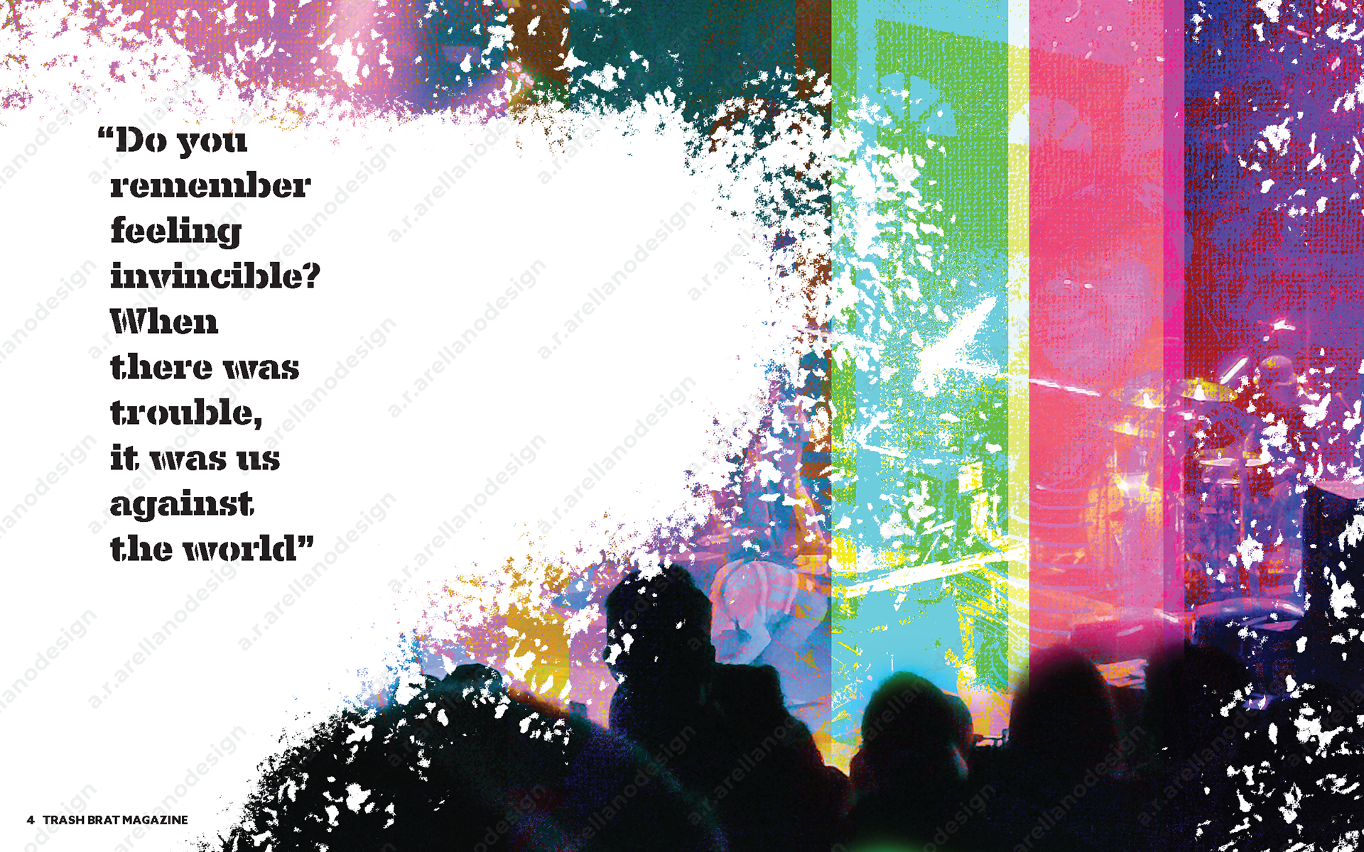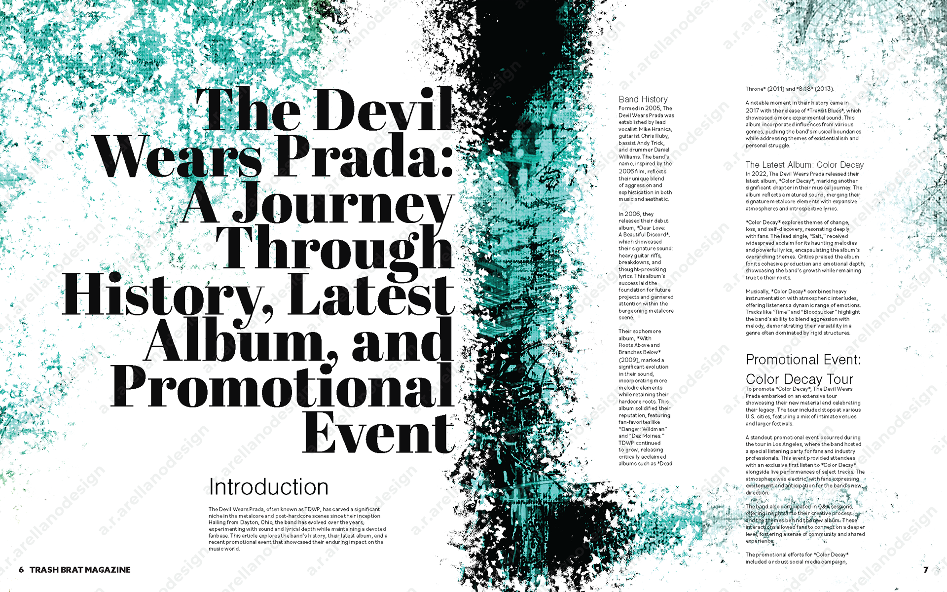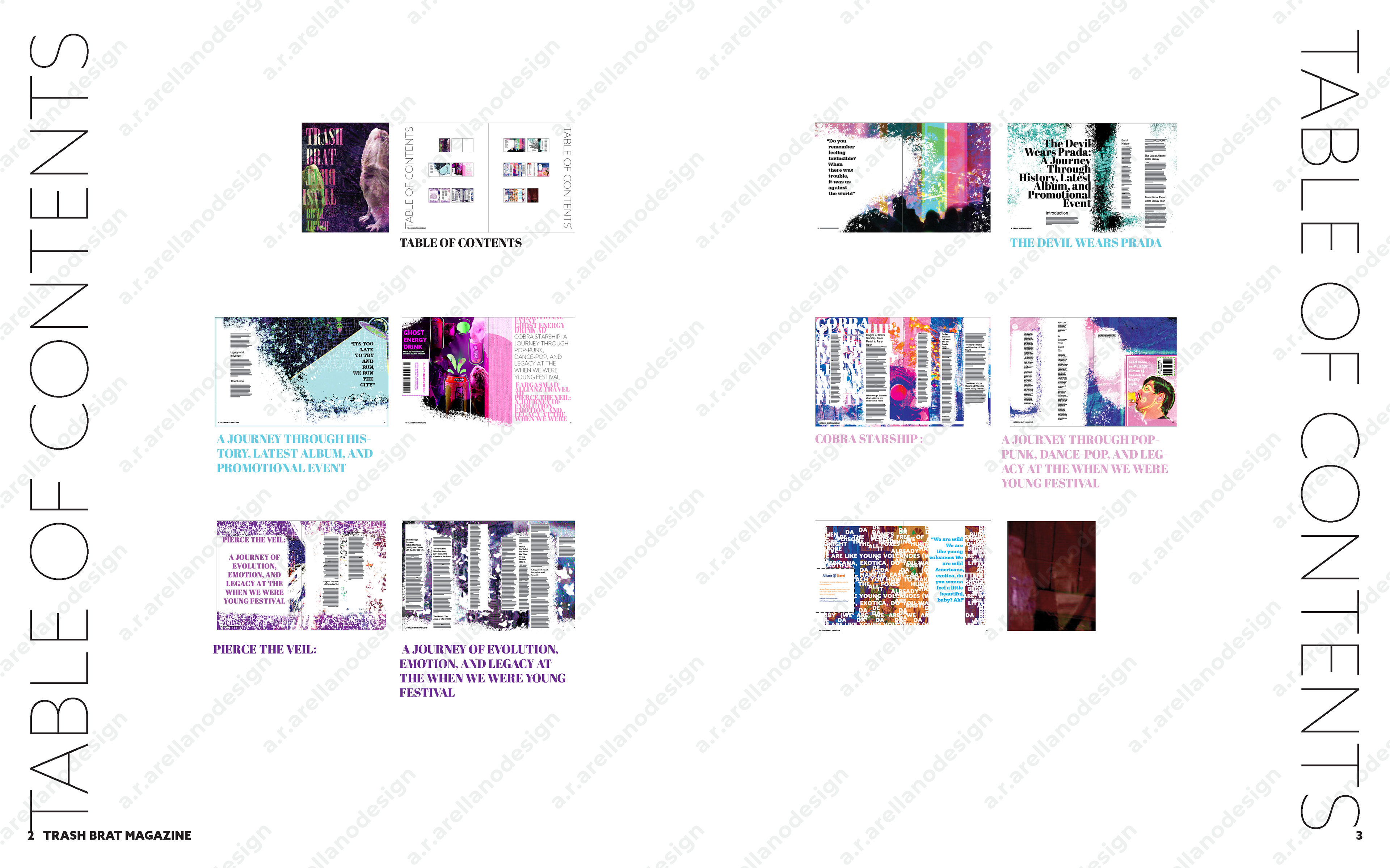 A magazine follows a format of columns and flowlines, establishing a pattern, that then becomes easier to break creating contrast. Trash Brat is a magazine created as a news article pop punk update on the bands playing at When We Were Young music Festival. Incorporated into the magazines are news articles about the bands along with advertisements on the sponsors that are endorsing the festival.